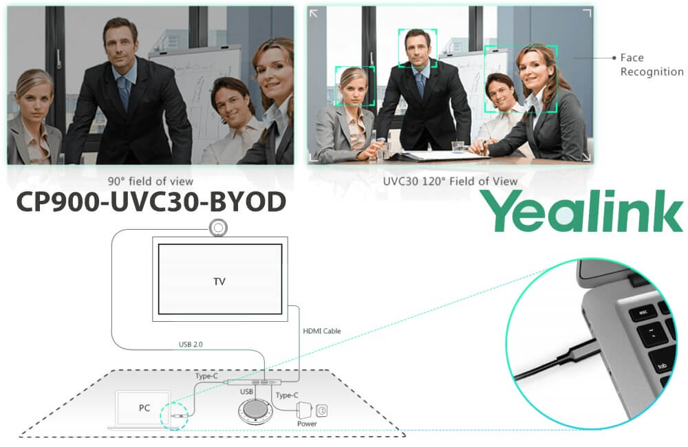 מצלמה מקצועית לשיחות ועידה לחדרי ישיבות מיקרופון מוגבר זווית צפייה 120 מעלות כולל טכנלוגיה לזיהוי פנים Yealink UVC30-CP900-BYOD Meeting Kit 4K UHD USB Zoom Digital X3 Desktop Confrence Camera HDMI + USB 3.0