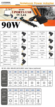 מטען אוניברסאלי למחשב נייד כולל 14 מתאמים ויציאת EZcool AD-805 Super 90W Power Adapter USB 2.4A Port 3xUSB