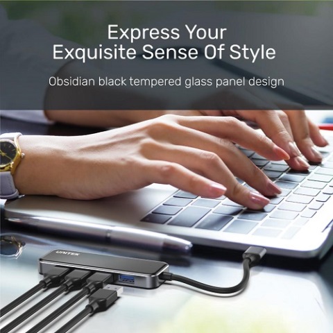 uHUB Exquisite היא סדרת רכזת USB-C המיוצרת בלוח זכוכית מחוסמת שחור אובסידיאן ומסגרת סגסוגת אלומיניום כדי להציע מראה עמיד ועמיד חזק. H1109A מציע לכם את 4 יציאות ה- USB להרחבה, ומחבר בין גאדג'טים USB שהייתם צריכים.