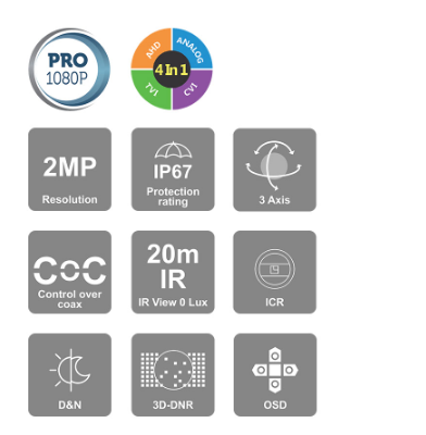 • פלט לבחירה: 2MP: 1920×1080 AHD/TVI/CVI 1MP: 1280×720 AHD/TVI/CVI CVBS: 700TVL