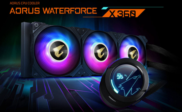 דגם קירור נוזלי למעבד ג'יגהבייט Gigabyte AORUS WATERFORCE X 360, All-in-one Liquid Cooler with Circular LCD Display, RGB Fusion 2.0, 120mm ARGB Fans AORUS WATERFORCE X 360