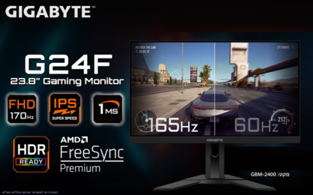 מסך מחשב דק רחב לגיימינג ג'יגהבייט Gigabyte G24F-EK 23.8 Inch SS IPS Full HD 1ms 165Hz 8BIT Gaming Monitor AMD Radeon FreeSync 2xHDMI 1xDP USB3.0 HUB