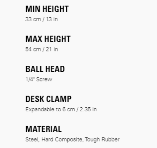 גובה מתכוונן מ 33 ס"מ עד 54 ס"מ, מאסטר מאונט S כולל ראש כדור, בורג 1/4 אינץ ', ומהדק 6 ס"מ / 2.35 מהודק להתאמה מדויקת בהגדרות שבהן יציבות מרבית היא המפתח. 1/