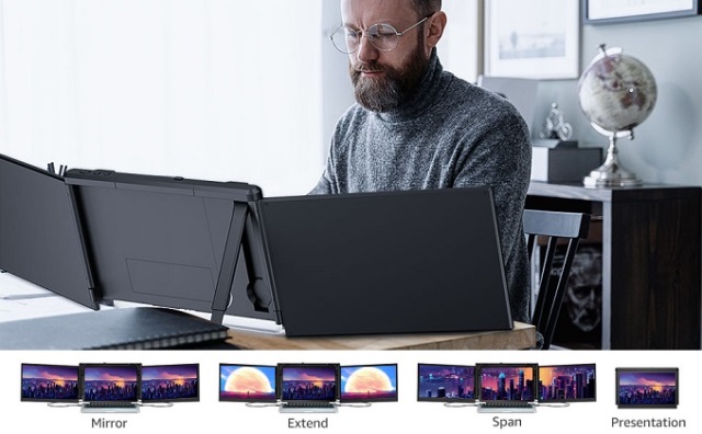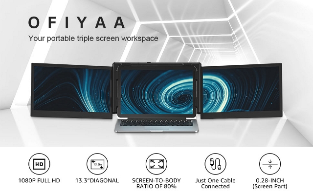 OFIYAA הוא צג מחשב נייד בעל מסך פונקציונלי רב תכליתי ונייד המאפשר לך לבנות במהירות תחנת עבודה אישית אישית ולעבוד בכל מקום ביעילות. הפיכת מחשב אחד לשלושה, תוכל להציג את התוכן בשלושה מסכים בו זמנית, מה שיכול להגדיל את הפרודוקטיביות שלך עד 50% ולממש ריבוי משימות יעיל.
