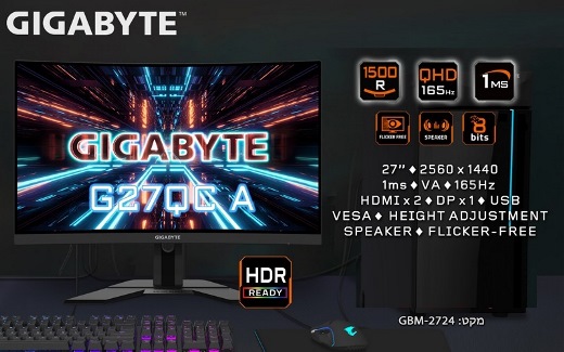 !!! מסך מחשב קעור לגיימרים עם רמקולים מובנים ג'יגהבייט אאורוס Gigabyte Aorus G27QC A 27 Inch VA 165Hz HDR 1ms QHD 2560x1440 Curved Gaming Monitor