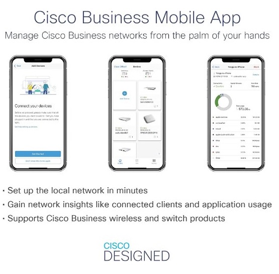 הפורטפוליו מנוהל באמצעות לוח המחוונים העסקי של Cisco והאפליקציה לנייד, ומספק חוויה פשוטה ואמינה.