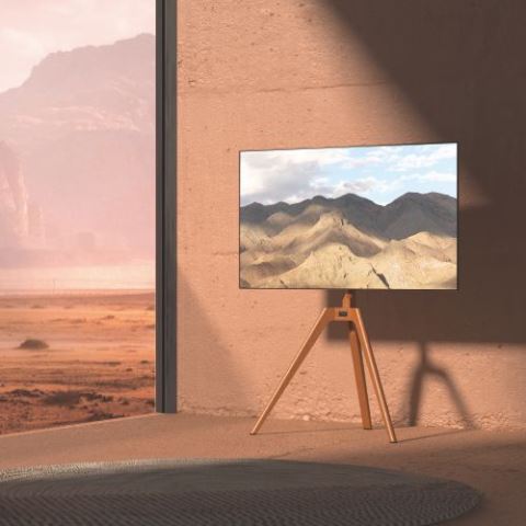 דגם מעמד חצובה מעוצב מעץ לטלוויזיה דגם ארט קנווס למסכים עד 65 אינצ' ומשקל 40 קילו Lumi FS35-44F-01 VESA 400X400 SOLID WOOD TV FLOOR STAND