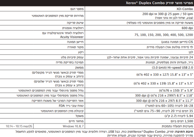 סורק נייד דופלקס צבעוני עם מזין למסמכים מופעל באמצעות יו אס בי Xerox Duplex Combo Scanner 100N03448 600DPI