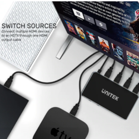מפצל ספליטר מסך להעברת תמונה ושמע ברזולוציית 4K כולל ספק כח כולל שלט יוניטק Unitek V1110A4K HDMI Switch 5 In 1 Out