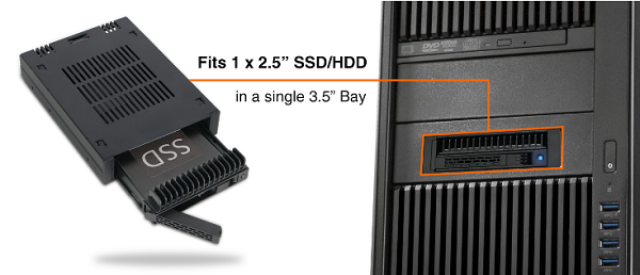 מציגה את ExpressCage MB741SP-B, מארז להחלפה חמה עם מפרץ יחיד עבור כל כונן קשיח SATA/SAS בגודל 2.5 אינץ' או SSD עבור המפרץ החיצוני בגודל 3.5 אינץ' (Floppy bay).
