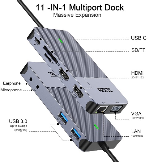 !!! תחנת עגינה מולטיפורט אוניברסלית למחשבים ניידים יציאה ל-3 מסכים נוספים כולל טעינה מתאים למחשבי מקבוק פרוטק Protec DM175 11 In 1 USB Type-C HDMIx2 Dual 2K VGA x1 Full HD Universal Docking Station
