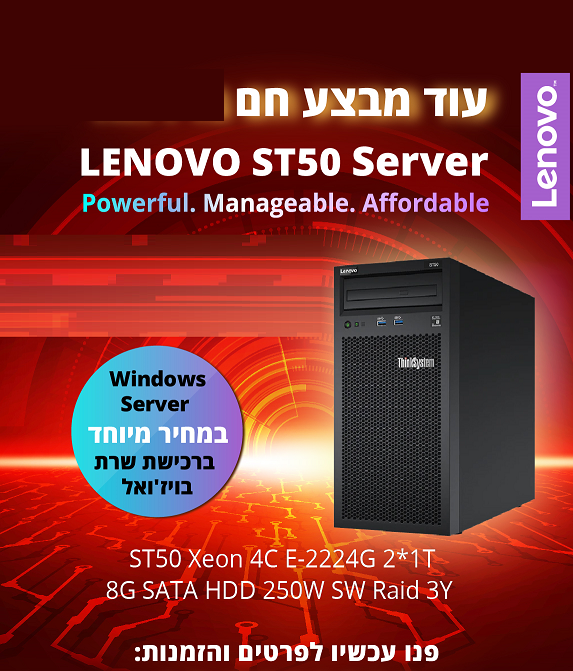 שרת לעסקים קטנים לנובו Lenovo ThinkSystem ST50 Server 7Y48A04JEA Intel Xeon E-2224G 4.7GHz 8GB RAM DDR4 2x1TB HDD 250W SW RD 3Y Free Dos
