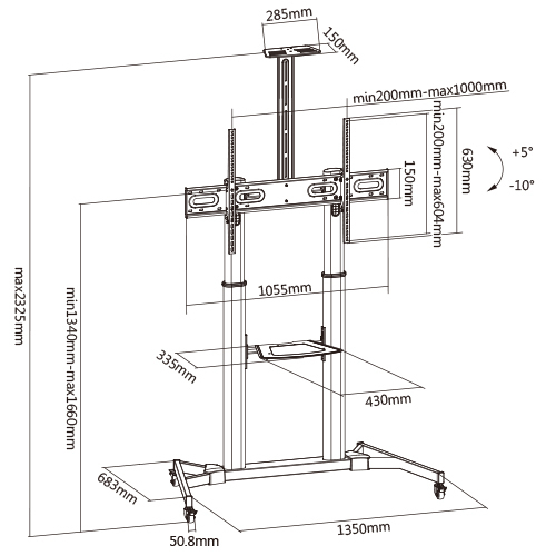 טכני מרחק ברגים: 200×200,300×300,400×200,400×400,600×400,800×400,800×600,1000×600 :VESA משקל נשיאה 100 ק"ג גובה מירבי 1660 מ"מ אפשרות לנעילה של 4 גלגלים כולל מדף לממיר/מקלדת (משקל מקסימלי על המדף: 5 ק"ג) כולל מדף למצלמה (משקל מקסימלי על המדף: 5 ק"ג) טווח סיבוב +5°~ -10° תו תקן: CA 65