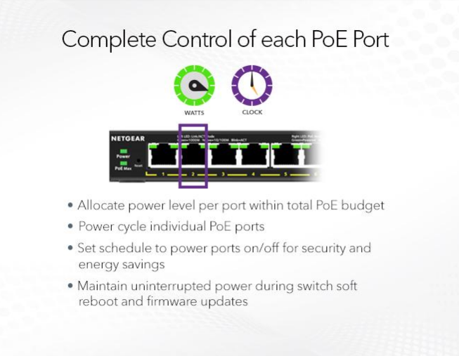 נהל תעדוף PoE, מגבלת כוח PoE לכל יציאה, תזמון PoE ועוד לשליטה פשוטה על כל המכשירים המופעלים על ידי PoE