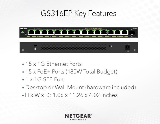 מתג 16 ערוצים כולל מתח לכל ערוץ נטגיר Netgear GS316EP 16-Port PoE+ Gigabit Ethernet Plus Switch (180W) with 1 SFP Port