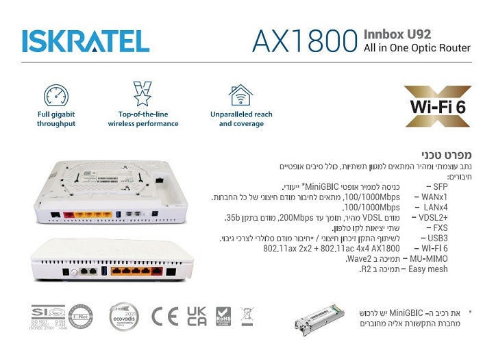 נתב אלחוטי עוצמתי ומהיר למגוון תשתיות כולל סיבים אופטיים Iskratel INNBOX U92 Universal Fiber Router GPON AX1800 WI-FI 6 Mesh 4G LTE