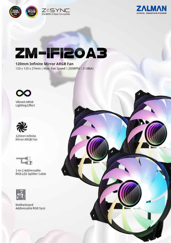 סט מאווררים למארז מחשב כולל תאורה זלמן ZALMAN ZM-IF120A3 120MM ZM-IF120A3 3 PACK Controller ARGB Case Fan