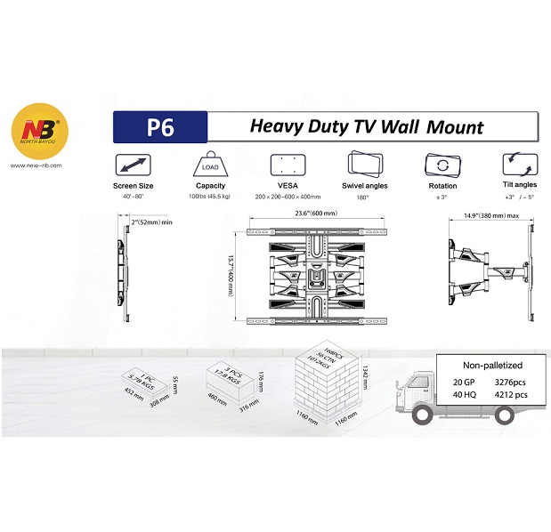 זרוע אקורדיון לטלוויזיה 3 מפרקים 52-380 מ''מ כולל הטייה וסיבוב למסכי LCD/LED לגודל מסך עד 80'' משקל עד 45.5 ק''ג NB North Bayou NB P6 New
