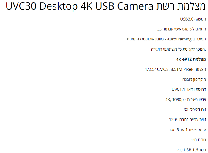 מצלמה מקצועית לשיחות ועידה לחדרי ישיבות זווית צפייה 120 מעלות כולל טכנלוגיה לזיהוי פנים Yealink UVC30 Desktop 4K UHD USB3.0 Zoom Digital X3 Desktop Confrence Camera