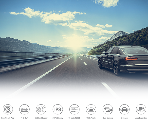 מסך IPS בגודל 3 אינטש, חיישן SONY IMX307, יכולת צילום בזוית רחבה של 150 מעלות (קדמית) ו-150 מעלות (אחורית), תמיכה בכרטיסי זיכרון מיקרו SD (עד 128GB), רזולוצית הקלטה של: 1920X1080 FHD, פורמט וידאו H.264, חיישן תנועה,