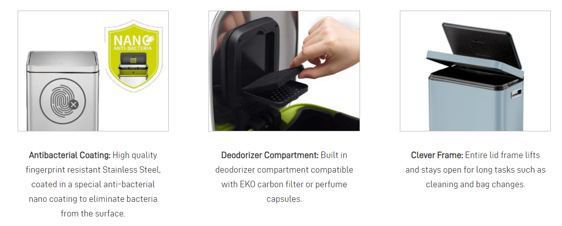ציפוי ננו אנטיבקטריאלי מיוחד הוחל גם כדי לסייע בשמירה על חיידקים. יש גם את היתרון הנוסף של אטם סיליקון ללכידת ריחות בפנים ותא מובנה לניקוי ריח שיעזור לשמור על ריח רענן של הפח שלך.