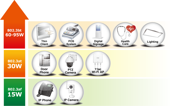 בנפח 802.3bt עם יציאות בודדות עם תפוקת חשמל של עד 95 וואט על כבלי Ethernet.