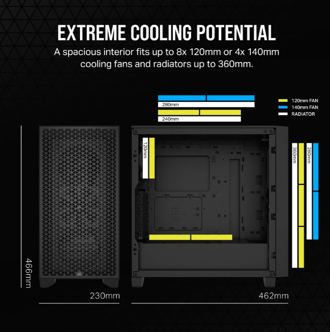 ה-CORSAIR 3000D AIRFLOW מציג שלדת ATX באמצע המגדל עם עיצוב יעיל בזרימת אוויר גבוהה, כולל שני מאווררי CORSAIR SP120 ELITE מותאמים מראש המספקים זרימת אוויר יוצאת דופן.