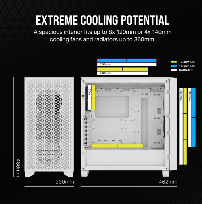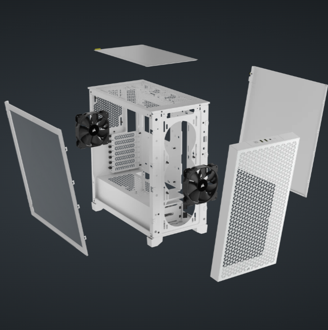 ה-CORSAIR 3000D AIRFLOW מציג שלדת ATX באמצע המגדל עם עיצוב יעיל בזרימת אוויר גבוהה, כולל שני מאווררי CORSAIR SP120 ELITE מותאמים מראש המספקים זרימת אוויר יוצאת דופן.