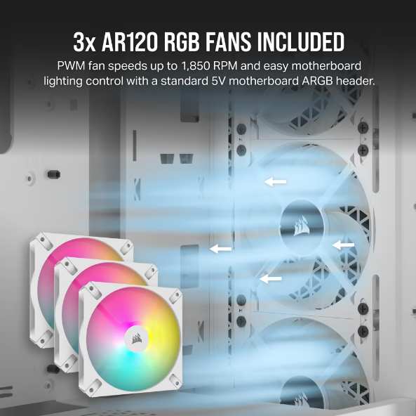 ה-CORSAIR 3000D RGB AIRFLOW מציג שלדת ATX באמצע המגדל עם עיצוב יעיל בזרימת אוויר גבוהה, כולל שלושה מאווררי CORSAIR AR120 RGB מותאמים מראש המספקים אפקטי קירור יוצאי דופן ואפקטי תאורה מלאי חיים.
