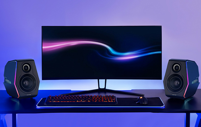 ארבע פסי אור היקפי של 360° מוטבעים בגוף הרמקולים האלו למשחקים.