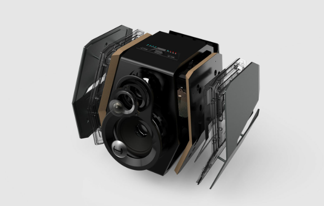 בשילוב ארון הרמקולים מעץ עם לוחות הצד מאלומיניום, המעצבים שילבו גם תצורה אקוסטית דגל וטכנולוגיית תאורת RGB ליצירת מראה ייחודי.