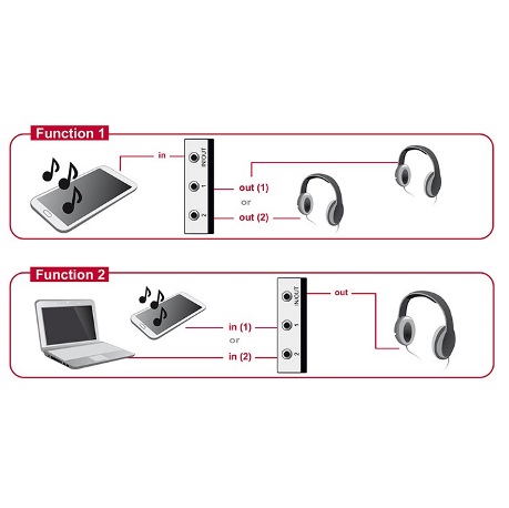 2. ניתן לחבר אותו לעד שני מכשירים עם יציאת שקע סטריאו, למשל. מחשב, מחשב נייד או נגן MP3 וחבר ליציאת הפלט אוזניות. על ידי שימוש בלחצן ניתן לבחור מאיזה מכשיר אות השמע מתנגן באוזניות.