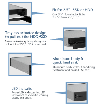 מגירה שליפה מאלומיניום ל-2 דיסקים קשיחים SNT N21SS 2 X 2.5'' HDD(SSD) SATA-III 12Gbit/S, SAS II 6.0Gbit Built On A Convenient 3.5'' Aluminium Mobile Rack