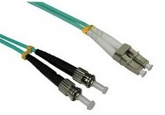 כבל אופטי MULTIMODE OM3 DUPLEX עם מחברי UPC קרמיים מסוג ST בקצה אחד ו-LC בקצה השני.