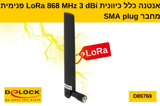אנטנה כלל כיוונית LoRa 868 MHz 3 dBi פנימית מחבר SMA plug דילוק Delock 89769 LoRa 868 MHz Antenna SMA plug 3 dBi omnidirectional with tilt joint black
