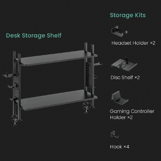 המדפים הדו-שכבתיים והלוח עם ערכות אחסון מאפשרים אחסון של אביזרי משחק וכן זרועות צג או מעמדי צג.