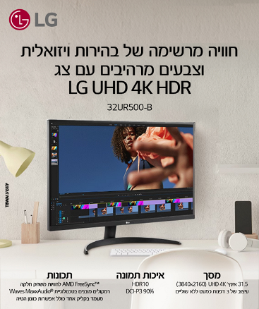 מסך מחשב דק שטוח 32 אינצ' כולל רמקולים אל ג'י LG 32UR500-B UHD 32'' 4K 3840x2160 HDR VA 4ms LED HDMI,DP