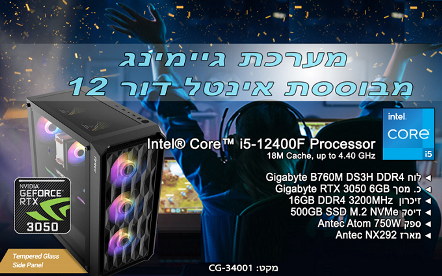 מחשב נייח לגיימרים דור 12 אינטל Gigabyte B760M DS3H Antec NX292 Gaming Case Intel Six Core I5-12400F 4.4GHz SSD 500GB M.2 NVMe 16GB DDR4 N-Vidia GeForce N3050EAGLE OC-6GD RTX 3050 Eagle OC 6GB HDMI Free Dos