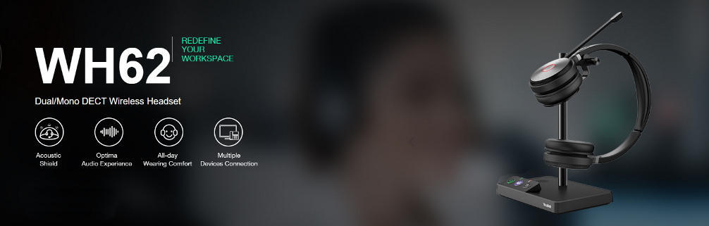 מערכת ראש אלחוטית מדונה חיבור לטלפון שתי אוזניים שחור ילינק Yealink WH62 DECT Wireless Headset Dou Black