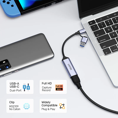 כרטיס לכידת וידאו חיצוני יוניטק HDMI ל- USB-C/A יוניטק Unitek V1167A HDMI to USB-C/A Video Capture Card 1080P 60FPS Plug and Play