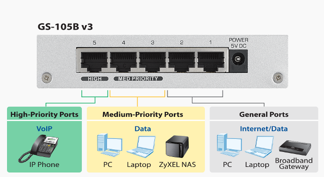 ל- GS-105B v3 יש 3 יציאות QoS עם מנגנון עם עדיפות גבוהה ובינונית כדי לשפר את היציבות של VoIP וחילופי נתונים. פשוט חבר התקני רשת כגון טלפונים IP, מחשבים, מחשבים ניידים או אחסון רשת ליציאות בעדיפות גבוהה או בינונית לבחירתך, לאחר מכן תוכל ליהנות מתקשורת VoIP חלקה והעברת נתונים בו-זמנית.