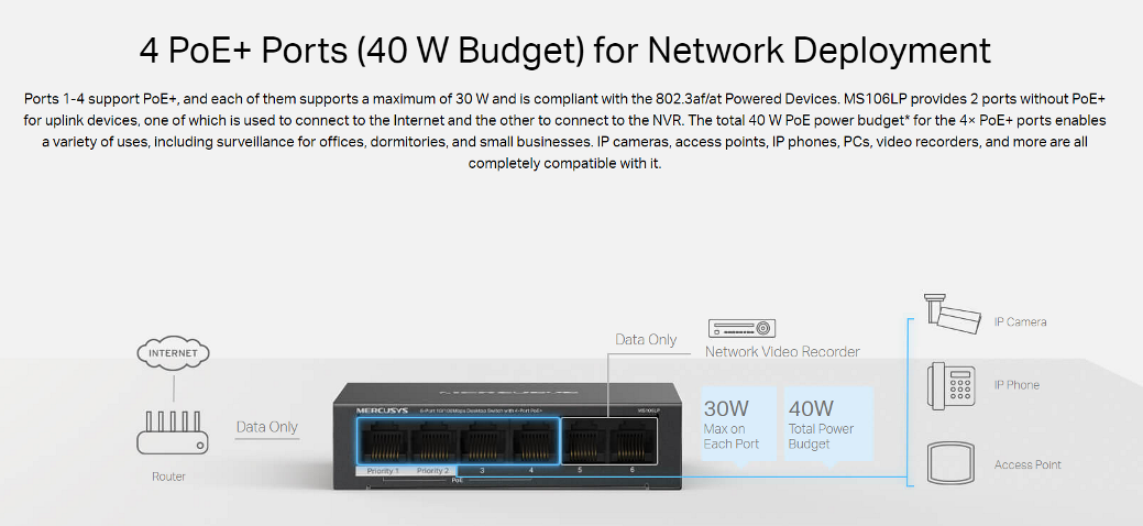 !!! מתג שולחני 6 פורטים ג'יגה מרקוסיס Mercusys MS106LP 6-Port Gigabit Desktop Switch with 4-Port PoE