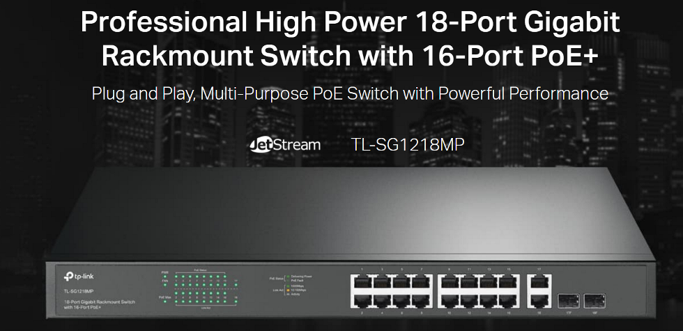 מתג שולחני 18 פורטים ג'יגה 16 כולל מתח טיפי לינק TP-Link TL-SG1218MP 18-Port Gigabit Rackmount Switch with 16 PoE+