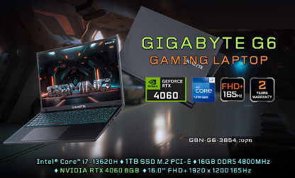 מחשב נייד לגיימרים 16 אינץ' אינטל דור 13 ג'יגהבייט Gigabyte G6 KF-H3EE854KD 16 Inch FHD+ 1920x1200 WUXGA 165Hz 16:10 Intel Core i7-13620H 10 Cores 24MB Cache 4.9GHz NVIDIA RTX 4060 8GB GDDR6 16GB DDR5 1TB M.2 2280 Gen4 RJ45 Free Dos