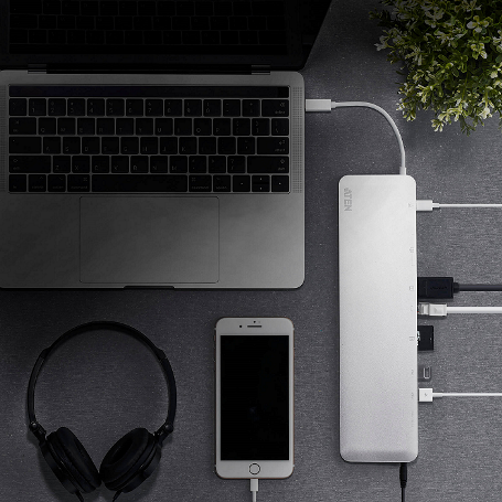 תחנת העגינה האלגנטית במיוחד ATEN USB-C מרובה יציאות עם Power Pass-Through