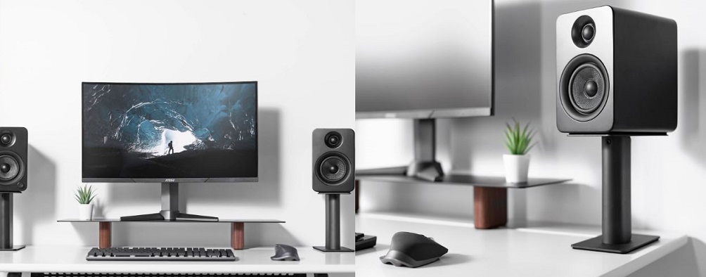 כל מעמד כולל עמוד תמיכה חלול לניתוב נוח של הכבלים שלך. תהנה יותר ממקום שולחן עם הרמקולים שלך מורם