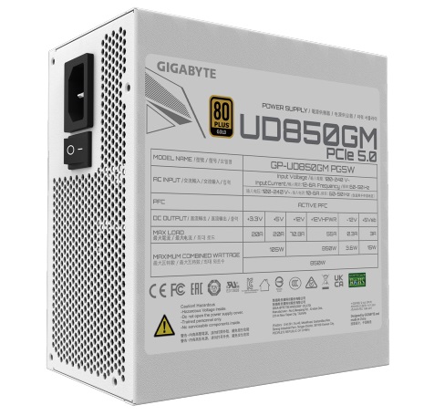 ספק-כוח למחשב נייח מודולרי מלא לבן ג'יגהבייט Gigabyte GP-UD850GM PG5W rev2.0 850W White 80+ Gold ATX 3.0 Fully Modular FAN 120mm
