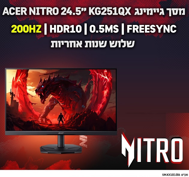 מסך מחשב לגיימרים 24.5 אינץ' אייסר Acer UM.KX1EE.006 Nitro KG251QX 24.5 Inch FHD 200Hz VA 0.5ms 250nits 2xHDMI DP AMD FreeSync Gaming Monitor