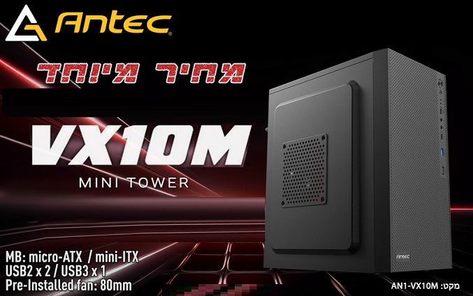 !!! מארז שחור מיני ללא ספק-כוח אנטק Antec VX10M Mini-Tower 1x 3.5 Inch 2x 2.5 Inch 2x USB2.0 1x USB3.0 80mm FAM Included Without PSU 0-761345-10174-5