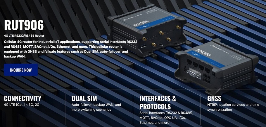 נתב תעשייתי סלולרי 4G טלטוניקה Teletonika RUT906 Industrial 4G LTE RS232/RS485 Router WiFi 4 802.11b/g/n WAN 100Mbps 3x LAN 100Mbps